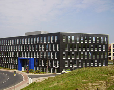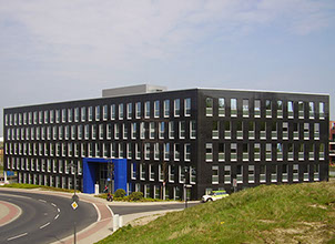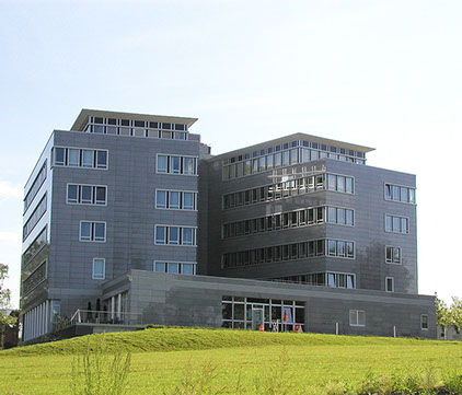 Neubau eines Verwaltungsgebäudes in Ratingen (2003). Fünfgeschossig mit Tiefgaragenebene, deckengleiche Unterzüge, Betonkernaktivierung. BGF 7.800 m2. Bausumme 7,4 Mio. €. Bauzeit 11 Monate.