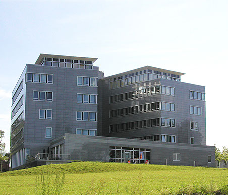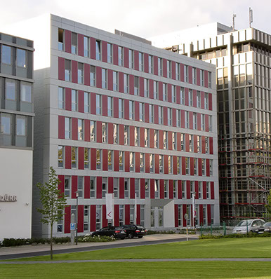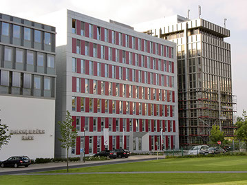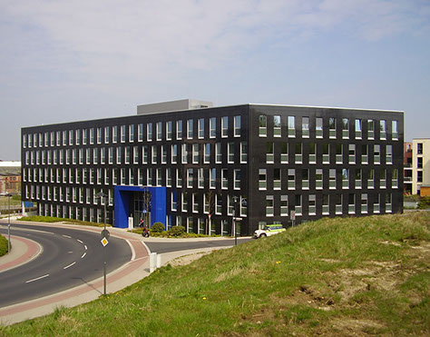 Neubau eines Verwaltungsgebäudes in Ratingen (2007). Siebengeschossig mit Tiefgaragenebene. BGF 9300 m2. Bausumme 9 Mio. €. Bauzeit 14 Monate. Positive Abtreppung der Straßenfassade. Unterzüge in den Flurbereichen. Betonkernaktivierung.