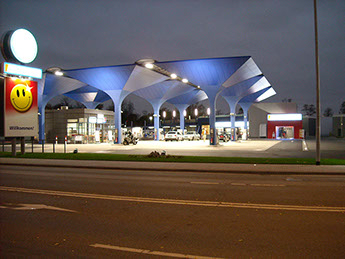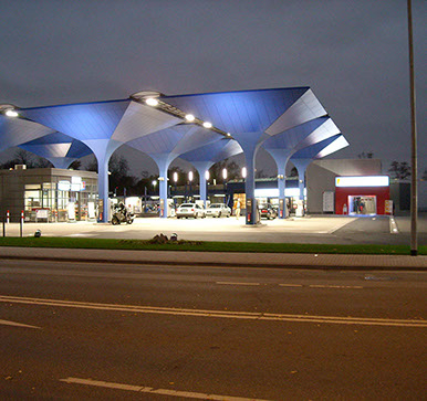 Neubau einer Tankstelle mit Waschstraße in Wiesbaden (2009) BGF 4500 m2. Baukosten 2,3 Mio. €. Bauzeit 9 Monate. Nach Wasserhaushaltsgesetz. Betonsonderkonstruktion der Zapfsäulenüberdachung.